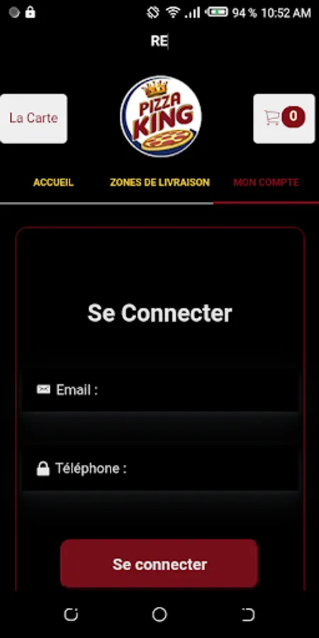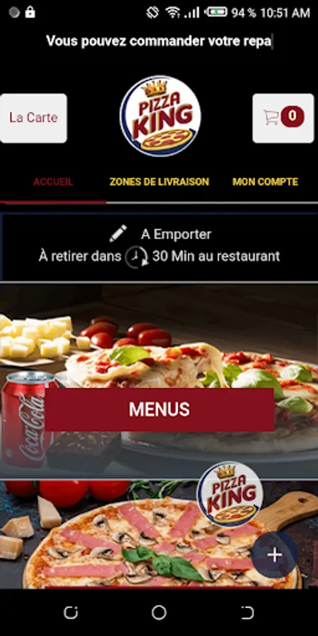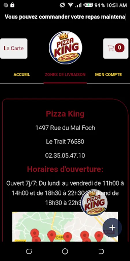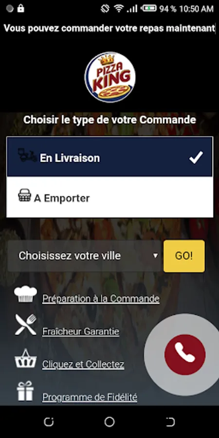 The Pizza King Android app allows you to order online or over the phone through your app. You can consult our menu and choose your products.