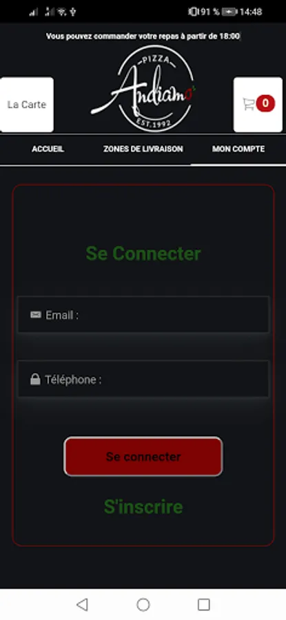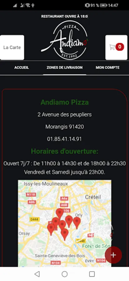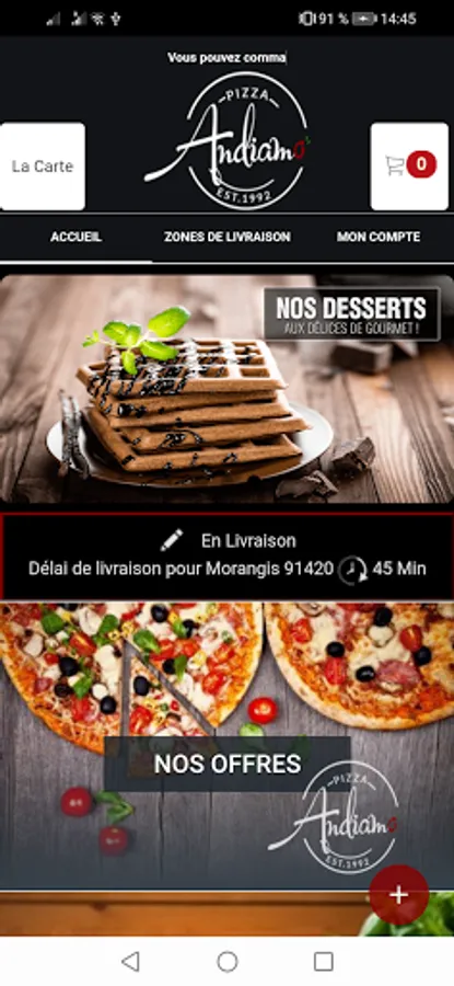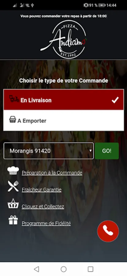 The Andiamo Pizza Android app allows you to order online or over the phone through your app. You can view our map and choose your products.
