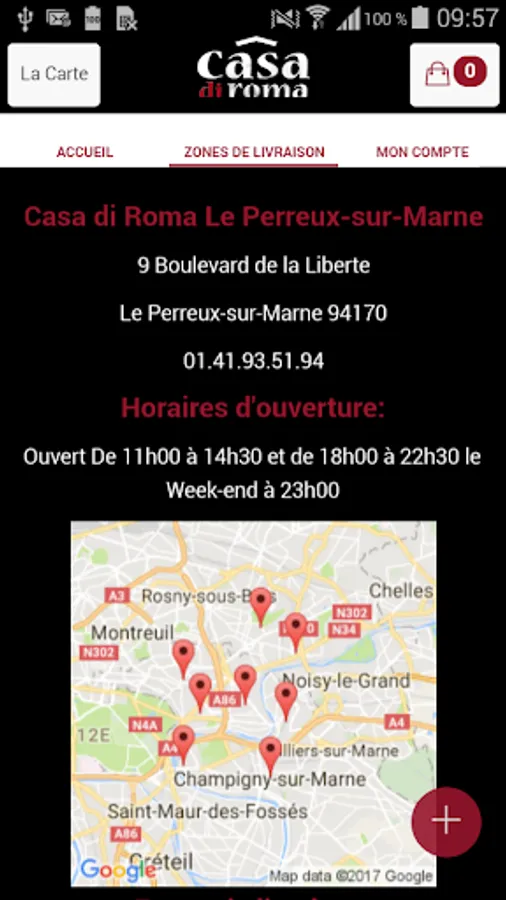 The Android app Casa di Roma Nogent allows you to order online or by phone through your application. You can consult our map and choose your products.