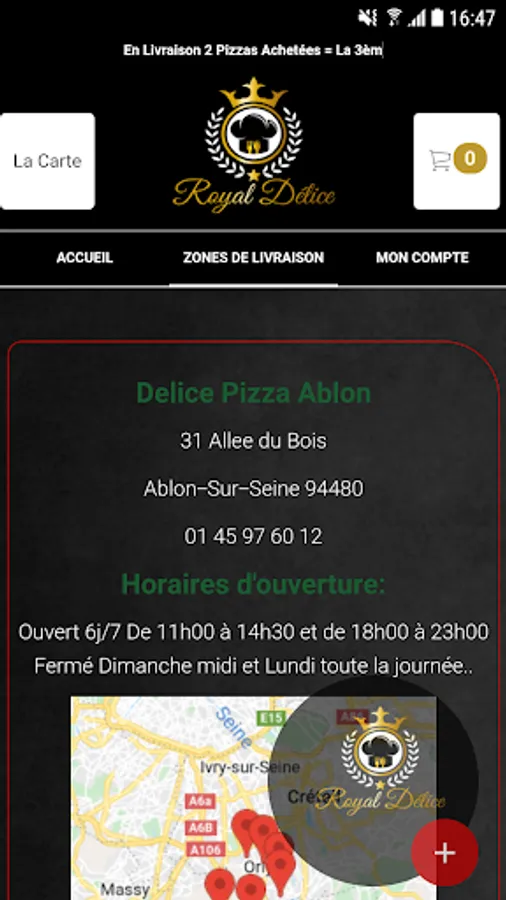 The Royal Delice Pizza Ablon Android app lets you order online or over the phone through your app. You can consult our menu and choose your products.