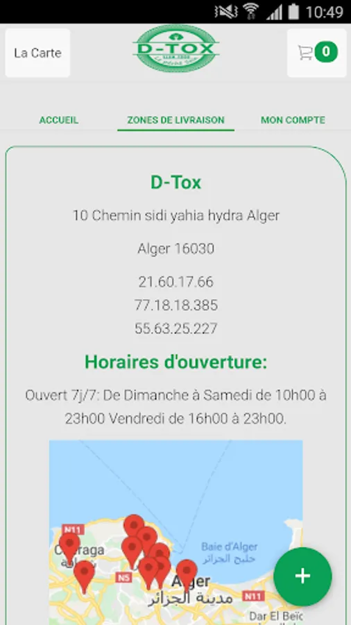 The Android application D-Tox allows you to order online or by phone through your application. You can view our map and choose your products.