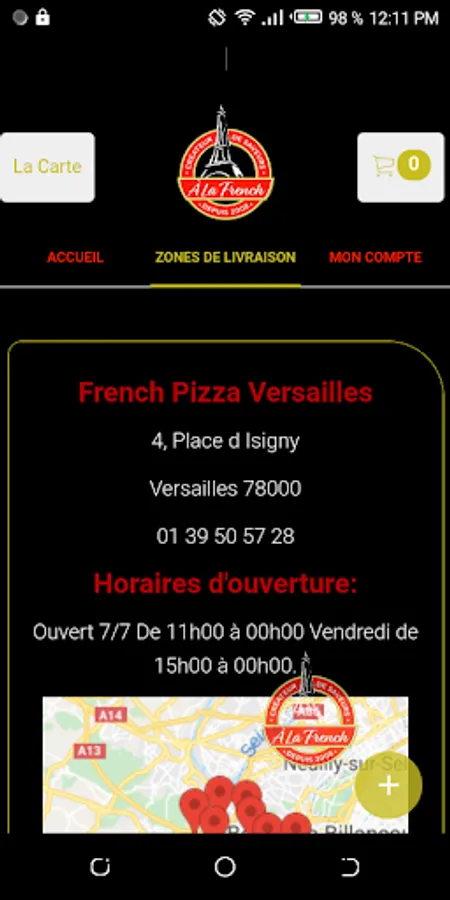 The Android French Pizza Versailles app allows you to order online or over the phone through your app. You can view our map and choose your products.
