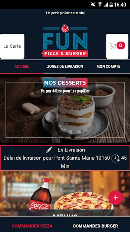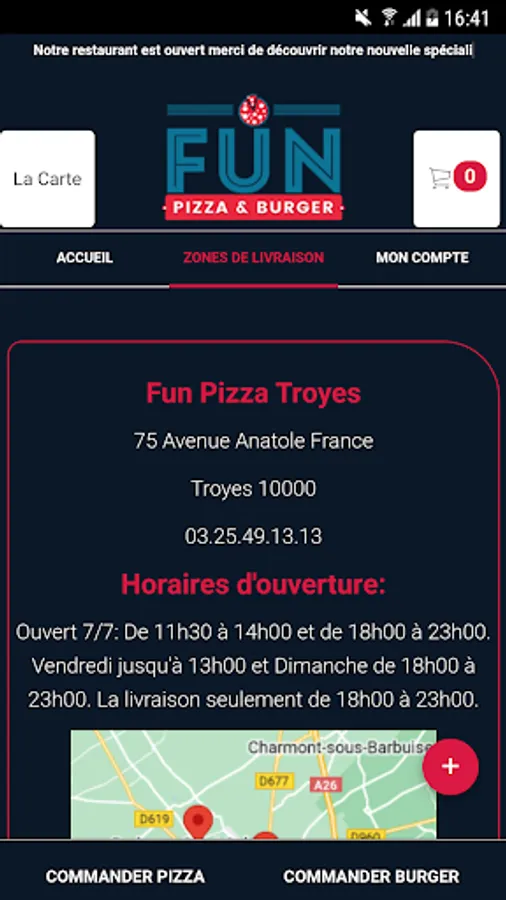 The Fun Pizza Troyes Android application allows you to order online or by phone via your application. You can consult our menu and choose your products.