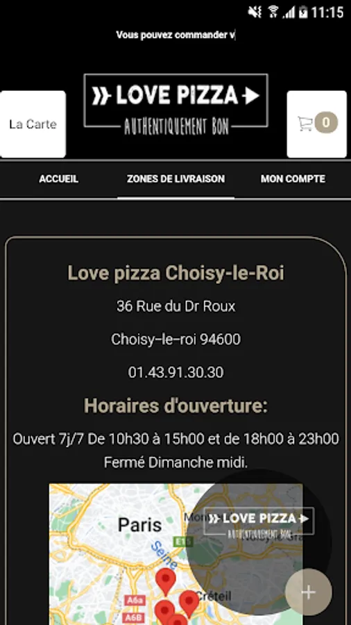 The Love pizza Choisy-le-Roi Android application allows you to order online or by phone via your application. You can consult our menu and choose your products.