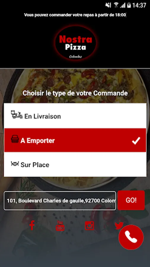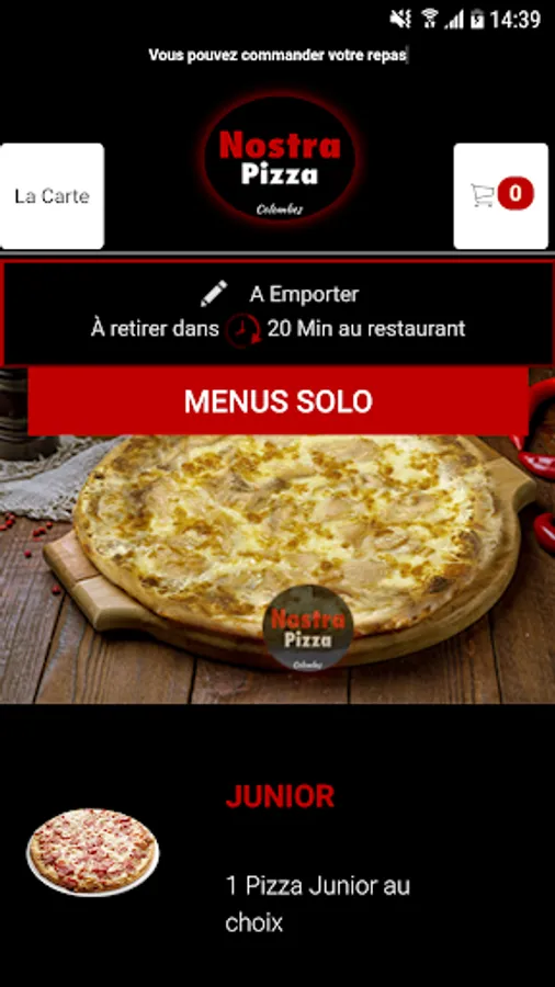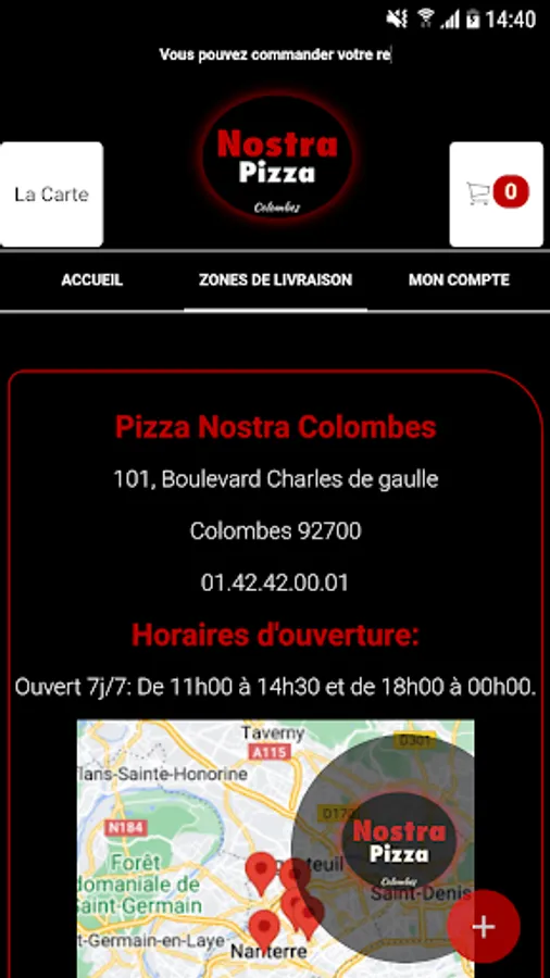 The Pizza Nostra Colombes Android application allows you to order online or by phone via your application. You can consult our menu and choose your products.
