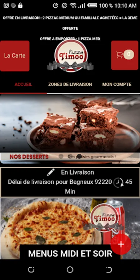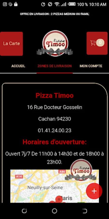 The Timoo Pizza Android app allows you to order online or by phone through your app. You can consult our menu and choose your products.