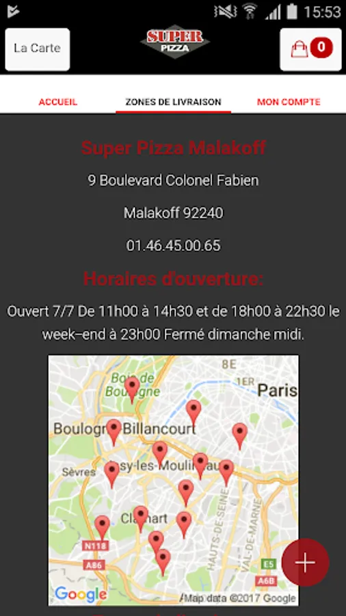 The Android Super Pizza Malakoff app lets you order online or by phone through your application. You can consult our map and select your products.