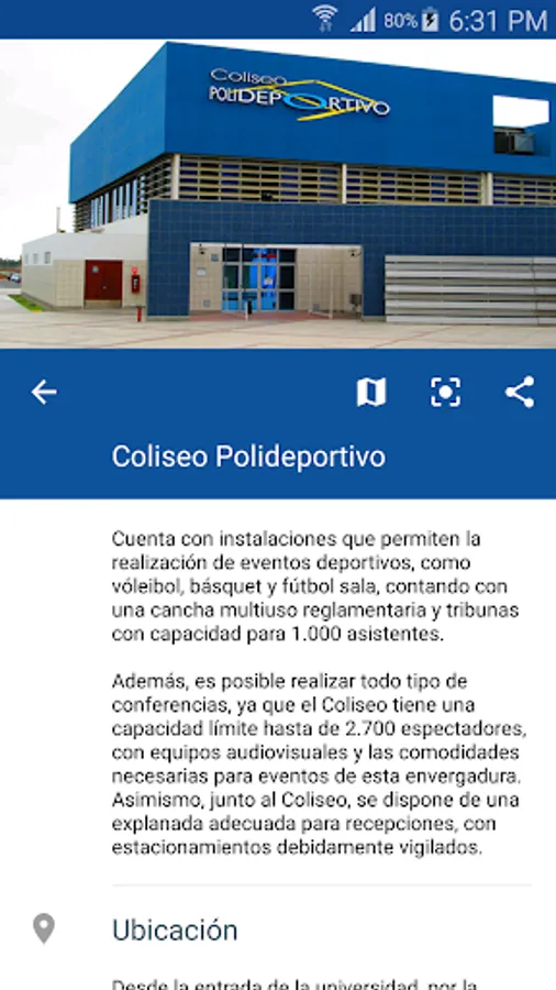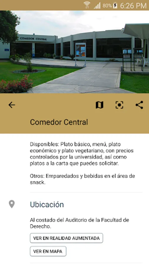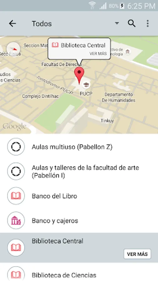 - Access to information over 200 locations within the PUCP as schools, libraries, photocopiers, auditoriums, cafeterias, etc. You will see descriptions, photos, opening hours, numbers, or email contacts, links and related sites, among others.