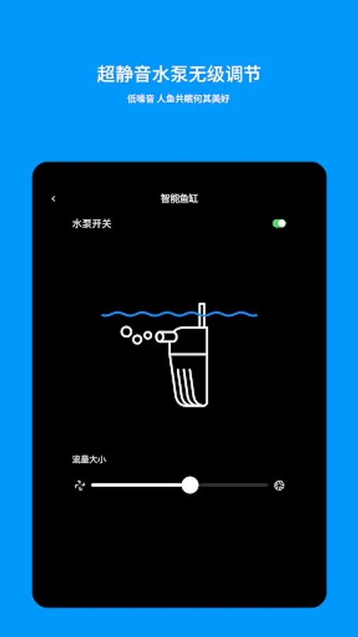 Through the APP, the flow rate of the water pump can be adjusted, and then the oxygen content entering the fish tank can be adjusted. When feeding the fish, you can turn off the water pump with one key, or reduce the speed of the water pump.