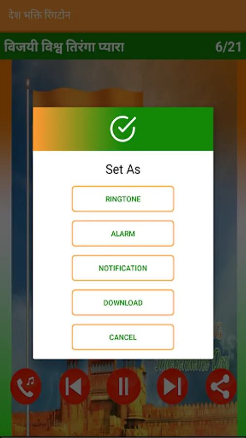 देश भक्ति रिंगटोन has features to set your desired song as ringtone for incoming calls, Alarm tone, Notification tone for incoming message etc.