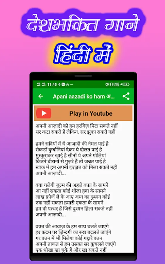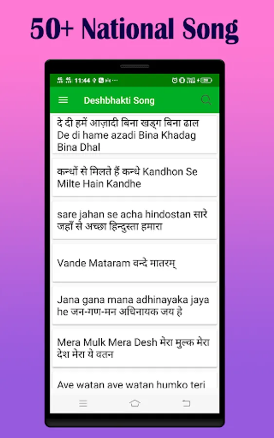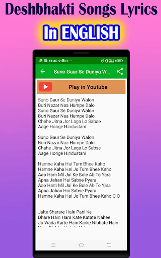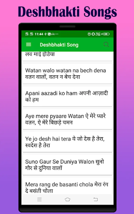 So in short, Deshbhakti song Lyrics apps provides Indian National Patriotic Songs Lyrics in Hindi and english as well as Deshbhakti Song