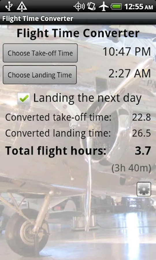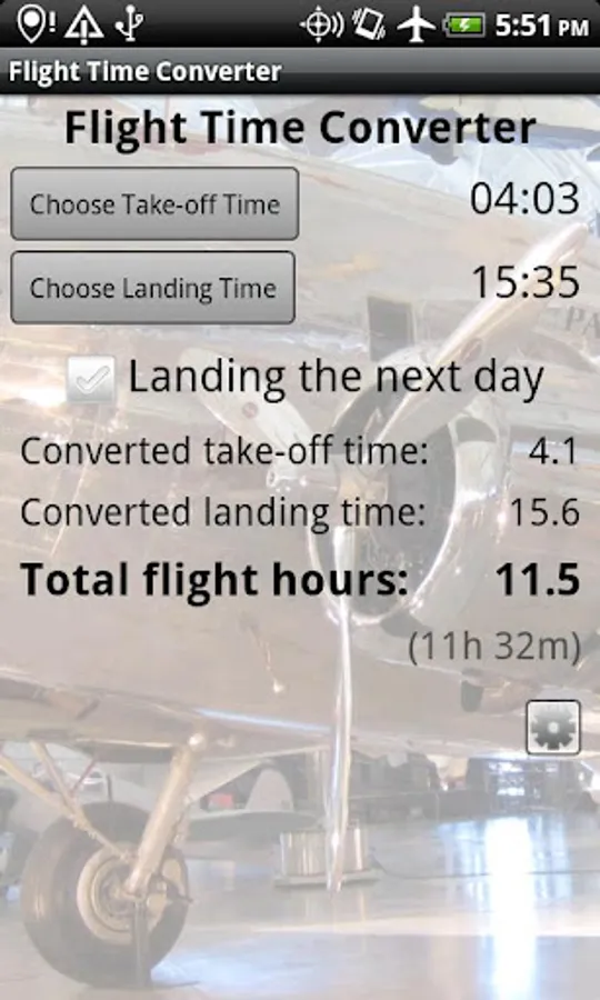 Enter the time you took off, the time you landed, and Flight Time Converter will automatically convert these times into decimal time and calculate your total flight hours.