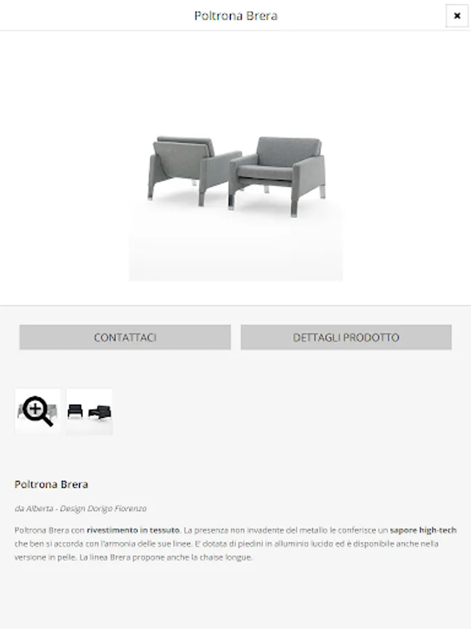 Inside the card is all the product details useful to guide you in your choice: name and product description, sizes, materials and features. With the photo gallery watch the furnishing product you selected in detail.
