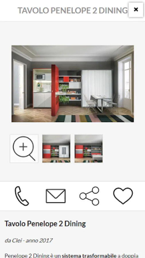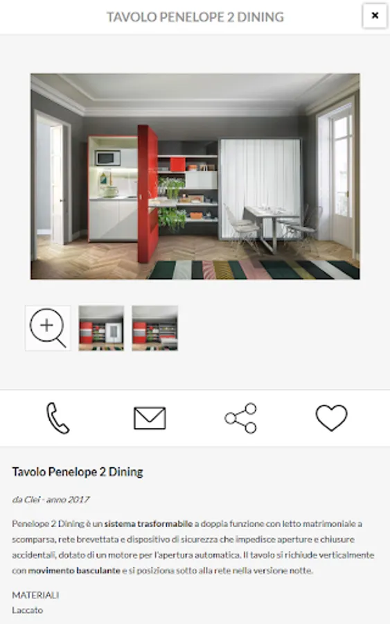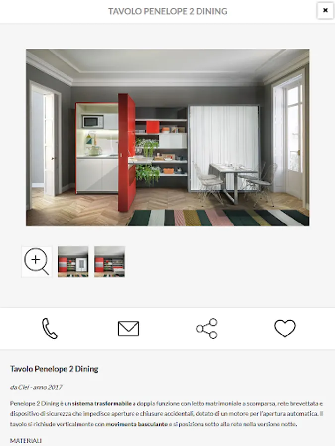 Inside the card product is all useful details to guide you in your choice: name and product description, sizes, materials and features. With the photo gallery watch the furnishing product you selected in detail.