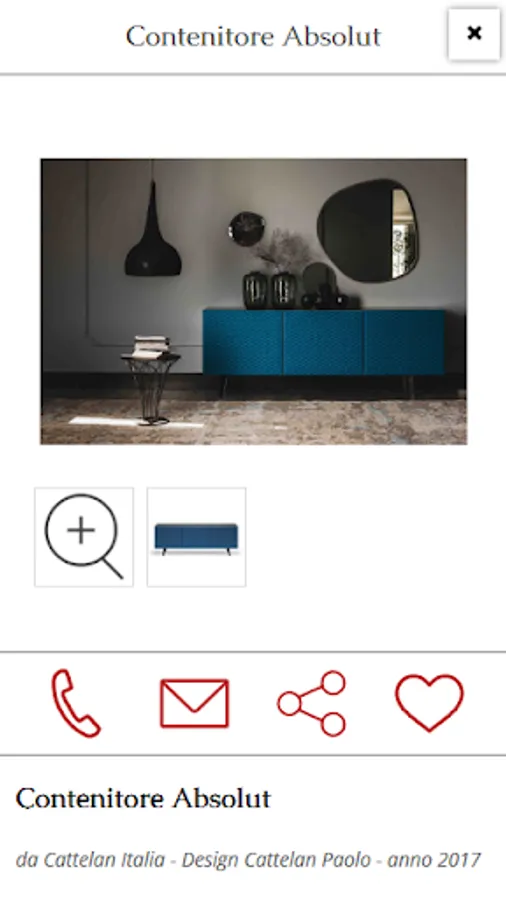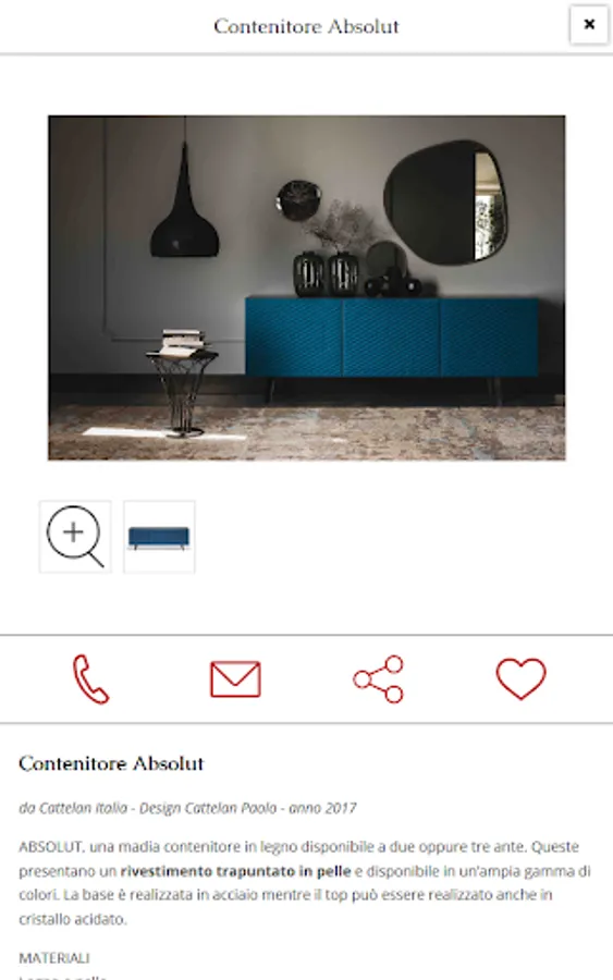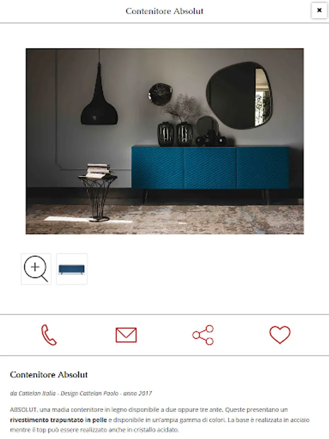 Inside the card product is all useful details to guide you in your choice: name and product description, sizes, materials and features. With the photo gallery watch the furnishing product you selected in detail.