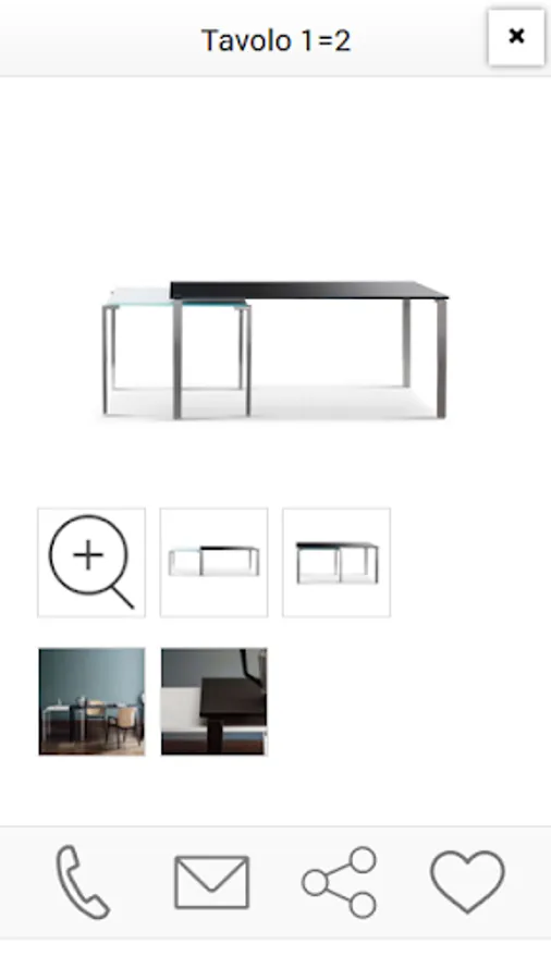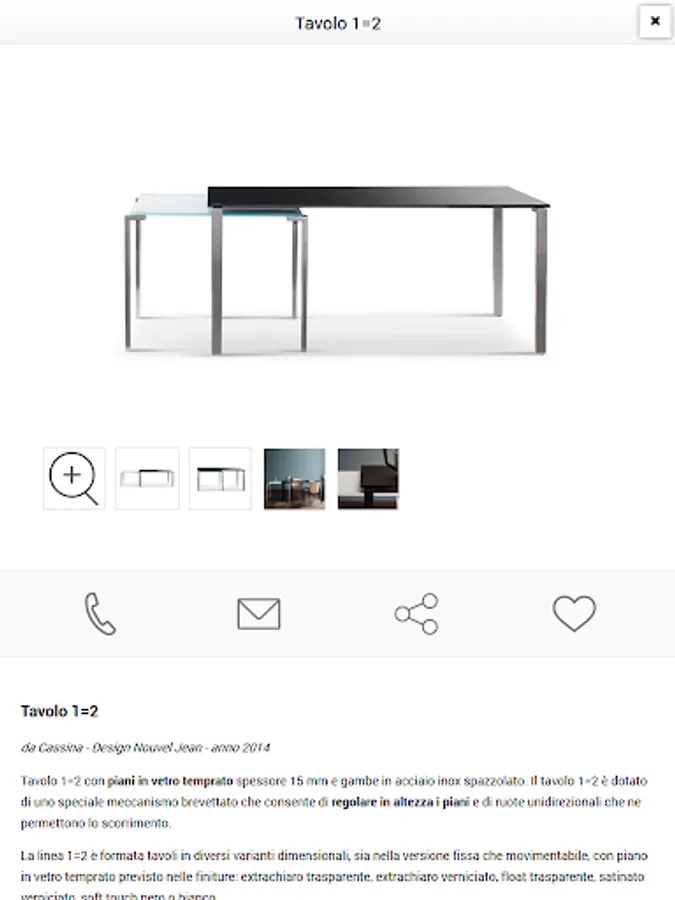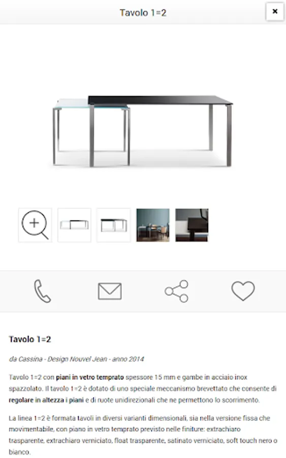 Inside the card product is all useful details to guide you in your choice: name and product description, sizes, materials and features. With the photo gallery watch the furnishing product you selected in detail.
