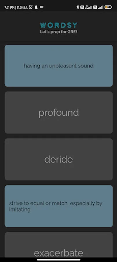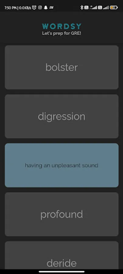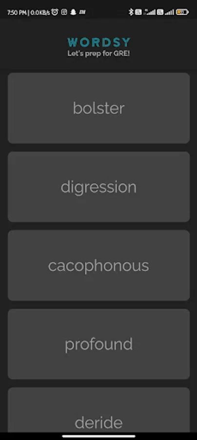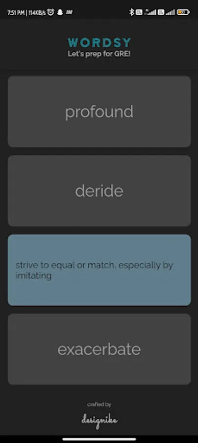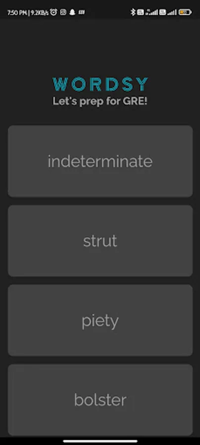 Wordsy collects 10 words a day for learner from frequently asked words of GRE. These words change every 24 hours. The meanings of words are shown as flip cards which makes it easy to learn and remember.