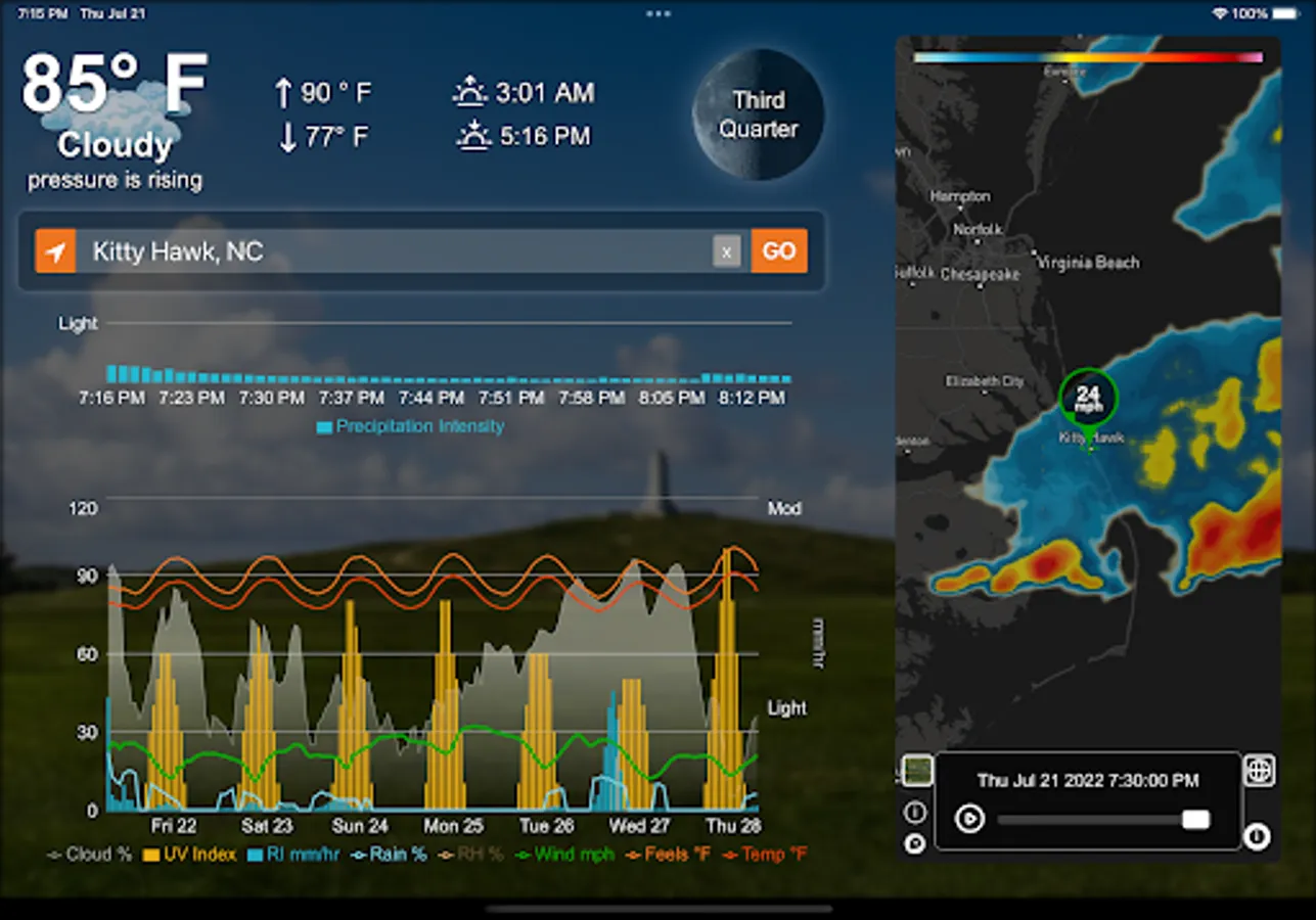 Hyperlocal forecasts worldwide from the best weather forecast service in the world, Apple. Perfect for getting a detailed view into what to expect when you get outside on your walk, hike or bike ride, whether in your neighborhood or on your favorite trail within the next hour or next week.