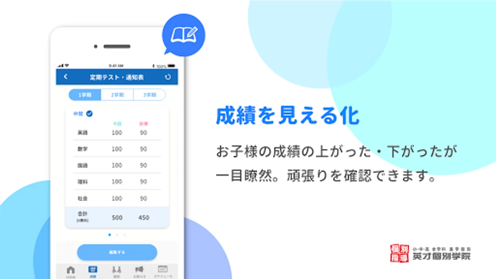 中間、期末などの定期的な試験、月ごとの模試の点数などが管理できます。