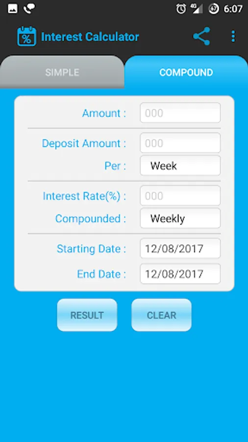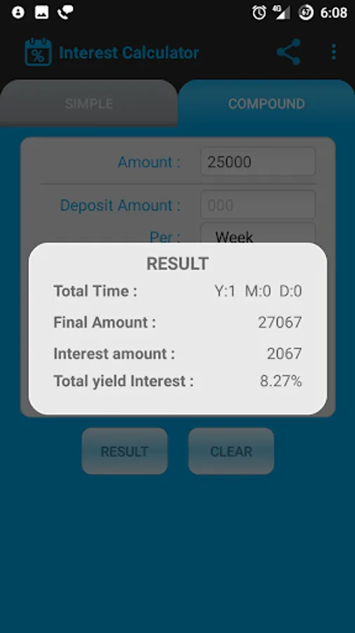 As the name suggests "Interest calculator" will calculate the interest in just one click. Also this app will calculate the complex compound interest specially if you want to calculate compound interest in which you are depositing a particular amount at particular intervals.(Like SIP).