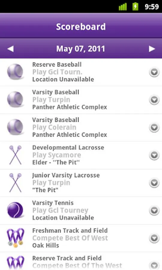 Most recent schedules and results for each sport including the date, time, location and opponent.