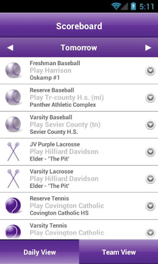Complete schedules in a daily or team view with results for each sport including the date, time, location and opponent.