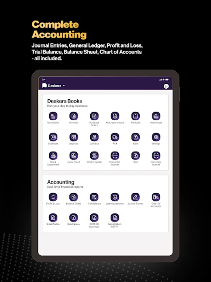 Deskera is a FREE app that will run your Business with a focus on Accounting, Sales & Purchase, Invoice, Inventory, Returns, Tax/GST, Reports, Expenses, Chat, Attendance while maintaining your Financial Reports and statements including Profit and Loss, Balance Sheet, Cash Flow.
