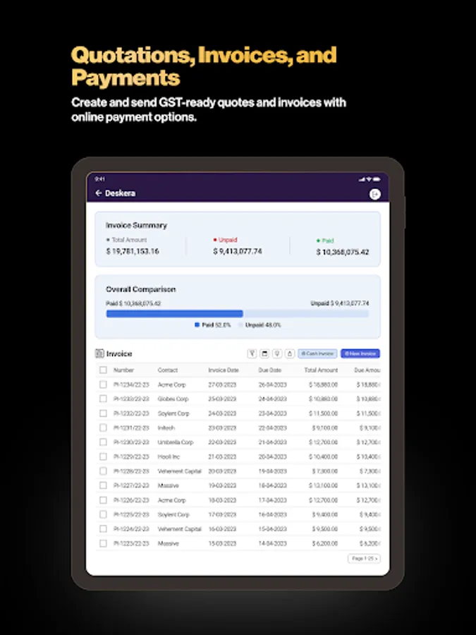 Deskera doesn’t restrict you to a desktop. Run your business on-the-go. With your phone, you have access to powerful Business, Invoice, Accounting, Inventory and Tax functions like creating an invoice, quotation and expense.
