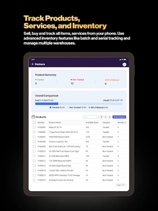 You can begin with setting up Business directly – send invoice or check Inventory or review Profit and Loss for your business, Deskera makes it easy to get started with your business operations. You can create invoice directly in front of your customer in just 3 easy taps.