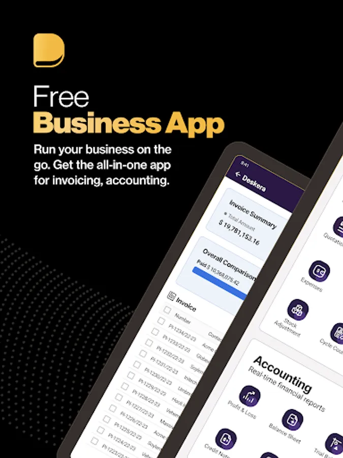 This business app is completely free. Unlike other Business and Accounting Apps, Deskera lets you run your business on the phone completely free.