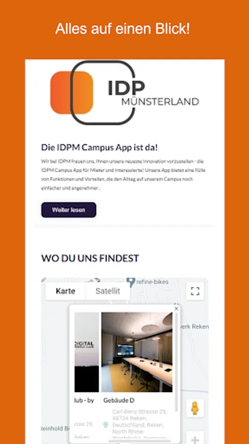Die IDPM Campus App ist die perfekte Lösung für Dich als Nutzer oder Mieter des IDPM Campus in Reken, um alle wichtigen Informationen und Angebote einfach und schnell zu erhalten. Mit dieser einfach zu bedienenden App hast Du Zugang zu den neuesten Neuigkeiten, Angeboten und Veranstaltungen des Campus, ohne dass Du Dich durch mehrere Seiten oder E-Mails wühlen musst.