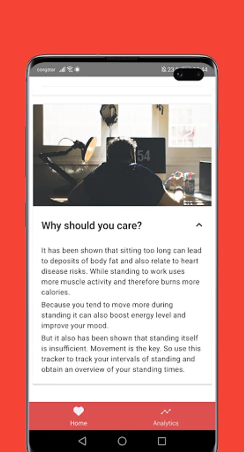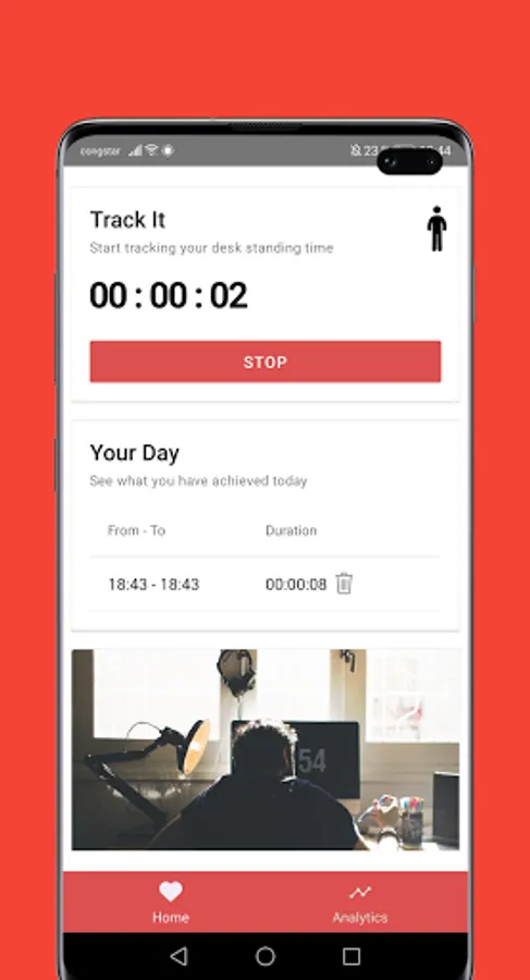 The Desk Standing Time Tracker App helps you staying motivated and keep on standing during work.