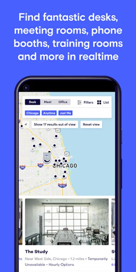 you — or in whichever city you select — and provides profiles and availability for each location. Simply click or tap to reserve a spot at that location for right now or anytime in the future.