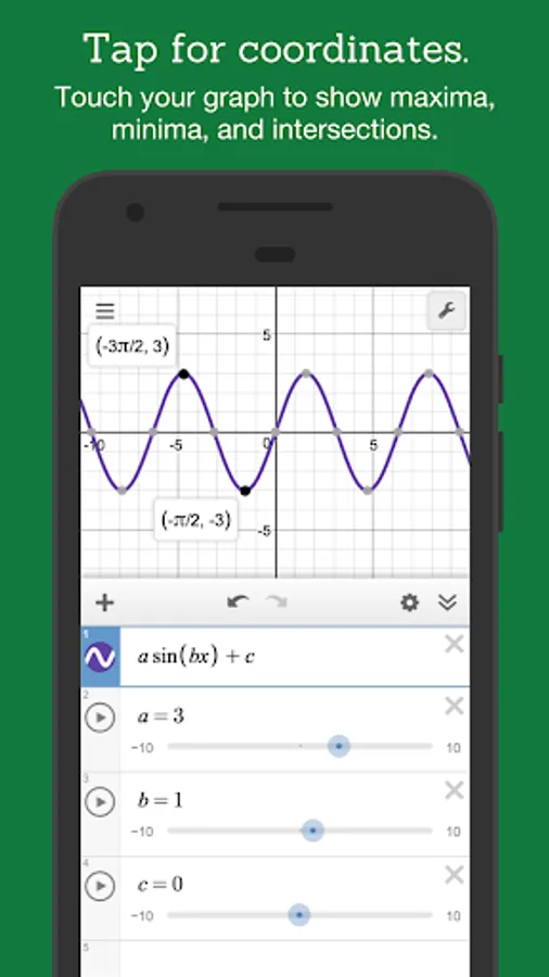 Points of Interest: Touch a curve to show maximums, minimums, and points of intersection. Tap the gray points of interest to see their coordinates. Hold and drag along a curve to see the coordinates change under your finger.