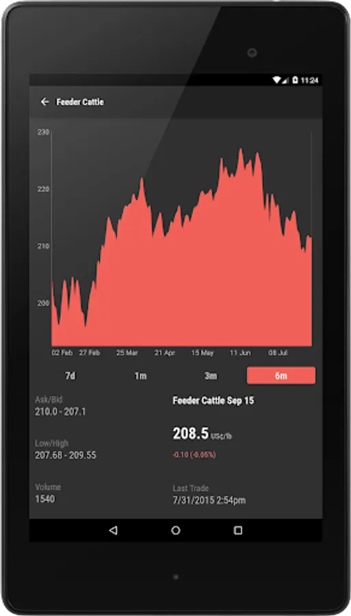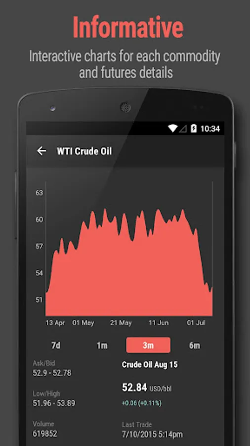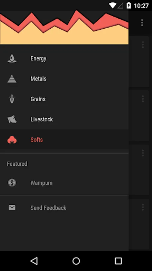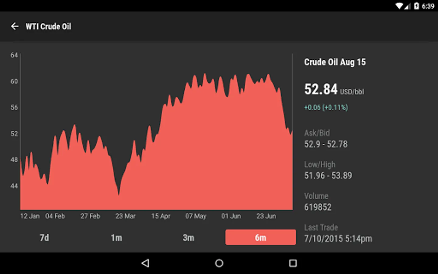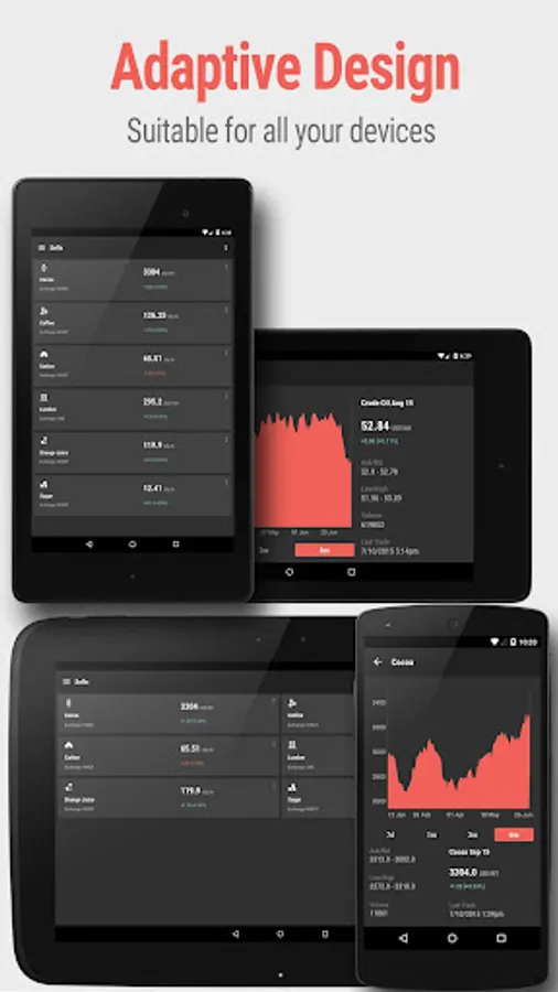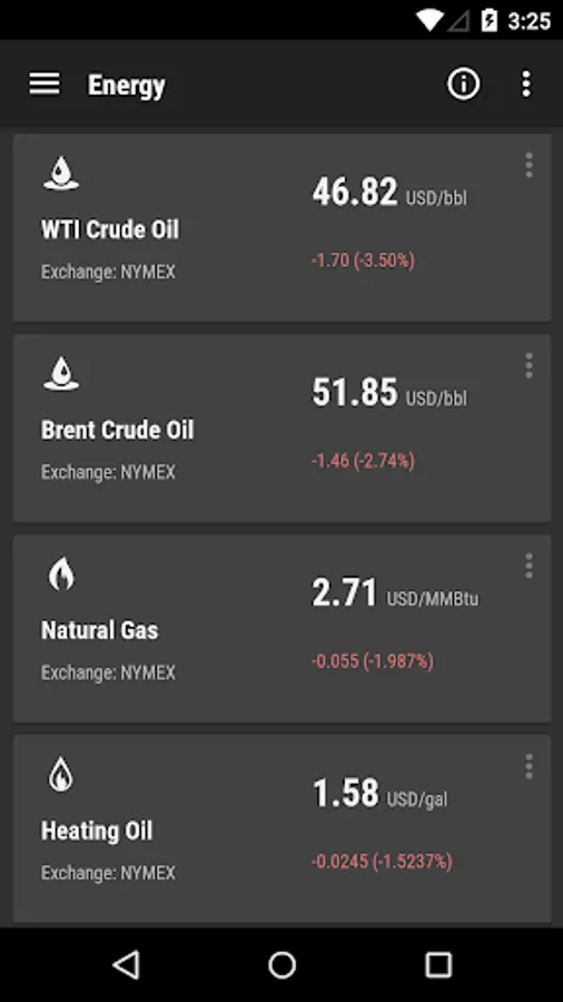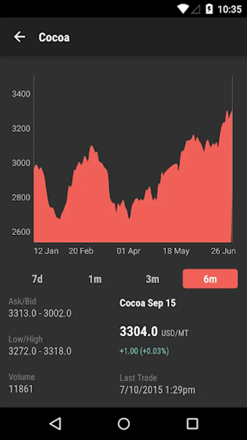 All stock market quotes are separated by corresponding categories. Each category contains a list of goods presented in the form of cards. Every item has it's own menu with options. - "Details" option. Find information about commodity prices and trading, such as ask, bid, high, low, volume etc. all in real time. In addition there is fully interactive historical stock charts showing data up to 6 months.