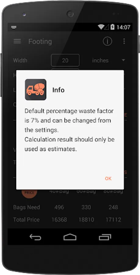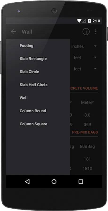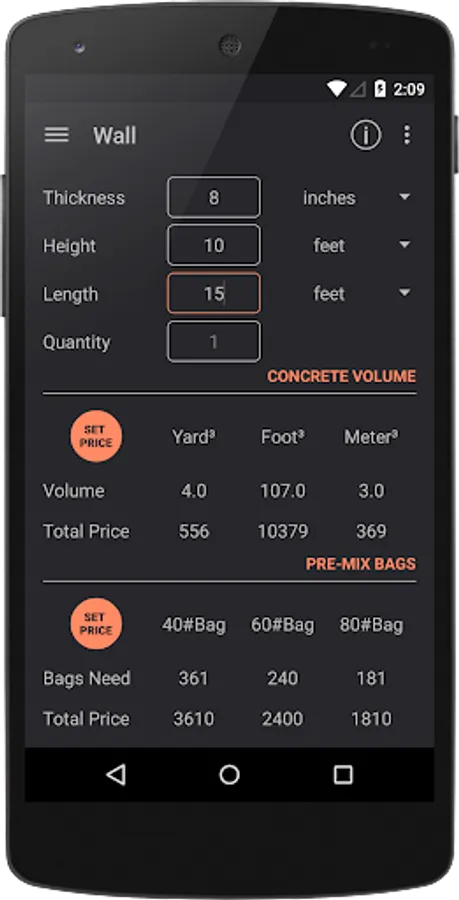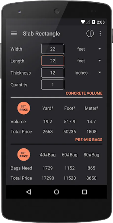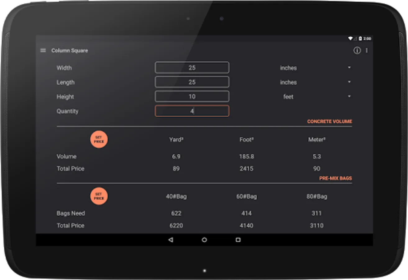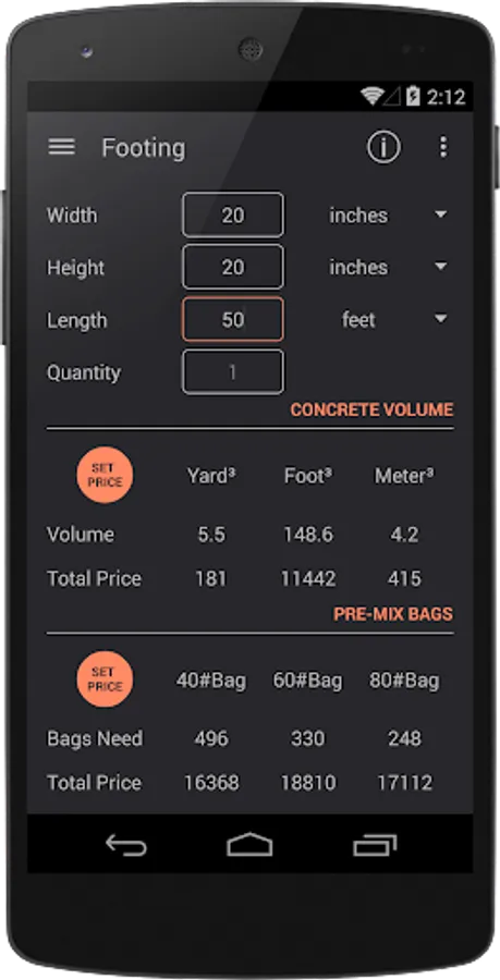 Makes easy to calculate the cubic yards or feet or meters needed for a variety of structures - including slabs, walls, footings and columns. Calculates the amount of 40#, 60# and 80# bags of premixed concrete you will need. Furthermore, you can set the price per volume unit or per package to estimate expenses.