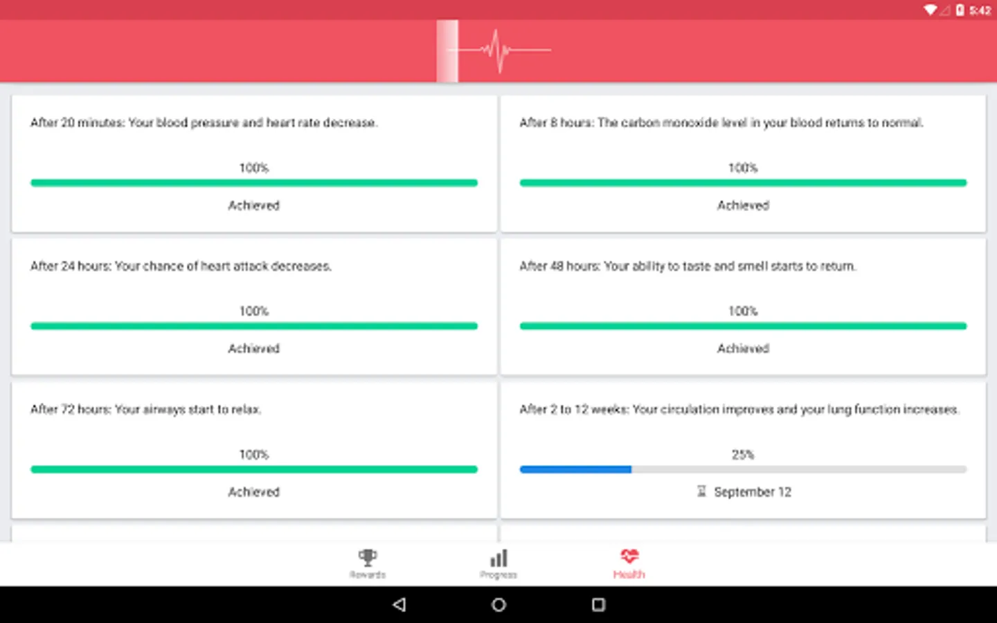 This is the perfect motivational tool for those that want to break this bad habit right now but find it hard to do so. A great motivator here is the Health tab where you can see the positive effects that quitting has on your body. Thankfully, you will also be able to track the progress and see how close you are to become smoke free.