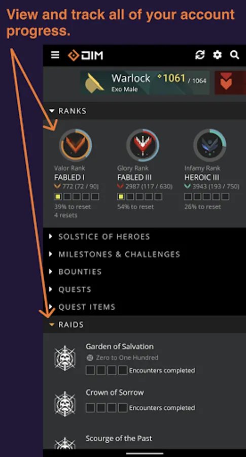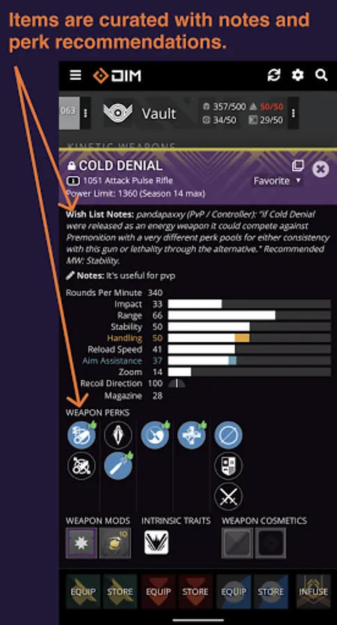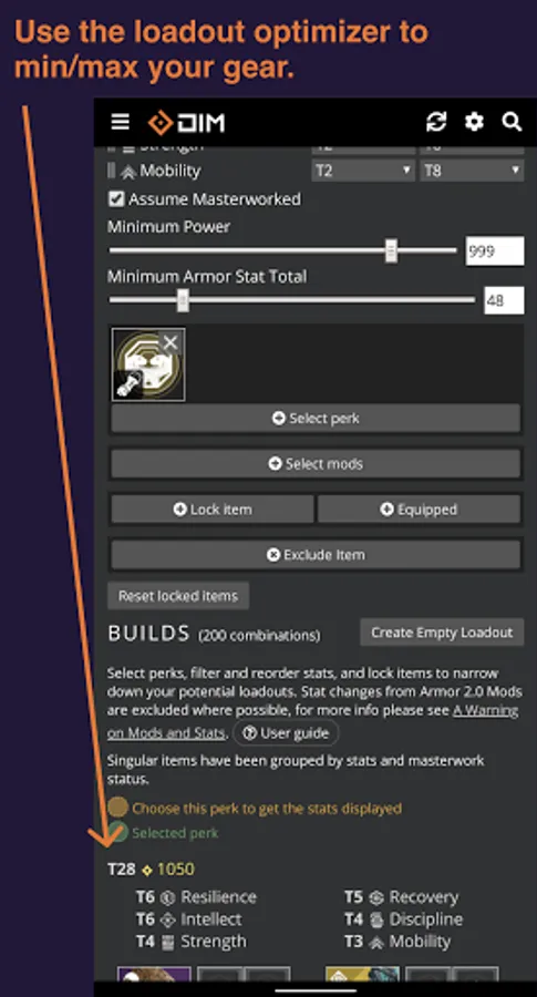 Use the built-in curated item lists to quickly find the best gear that you own.