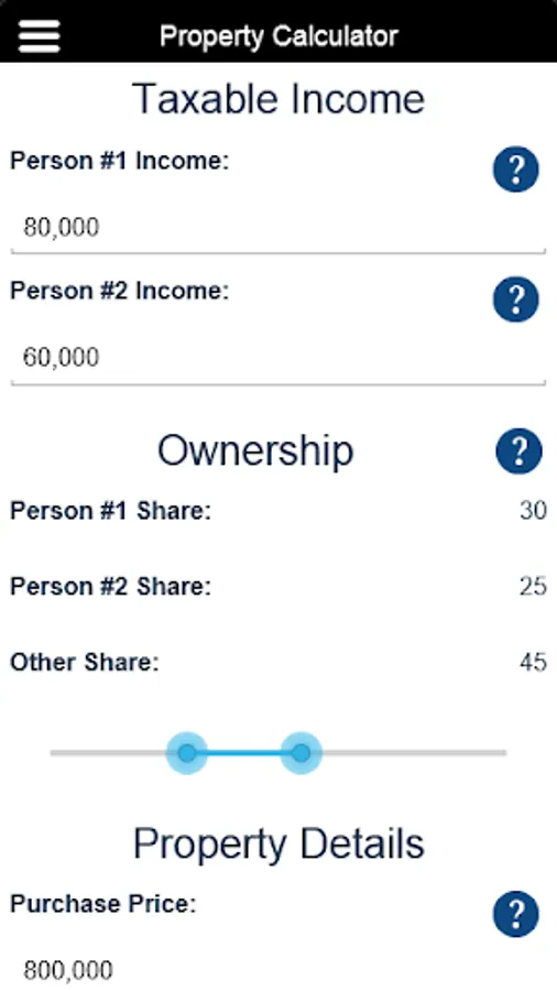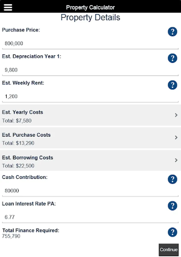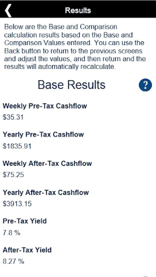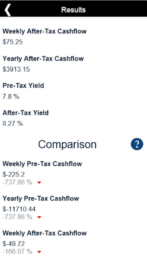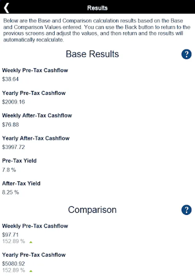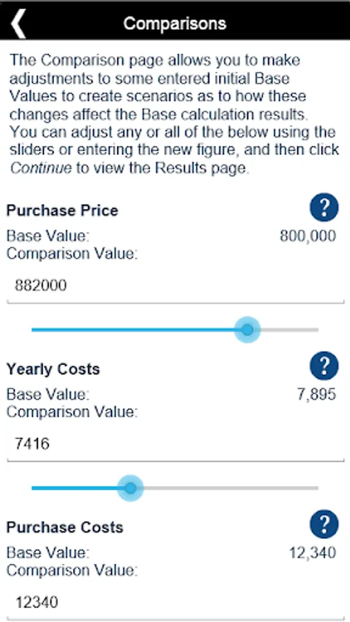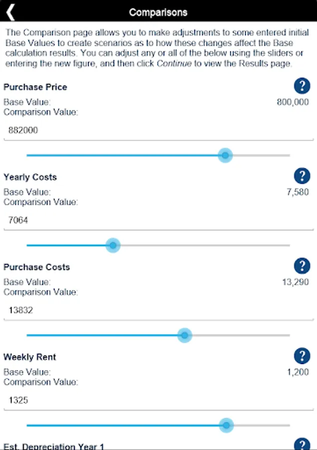 Investments like with life often don’t turn out exactly the way we hope or think, so with DestinyLive Mobile you can build various scenario combinations to be sure you have all scenarios considered before making a decision. For each calculation you can quickly and easily build a Comparison Scenario by adjusting Base figures such as Purchase Price, Purchase Costs, Depreciation, Vacancy, Yearly Costs, Ownership and Interest Rate. Alter one Base figure, or all, it is up to what you need to have peace of mind in the decision making process.'