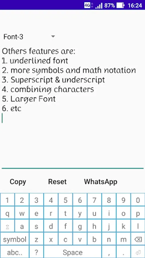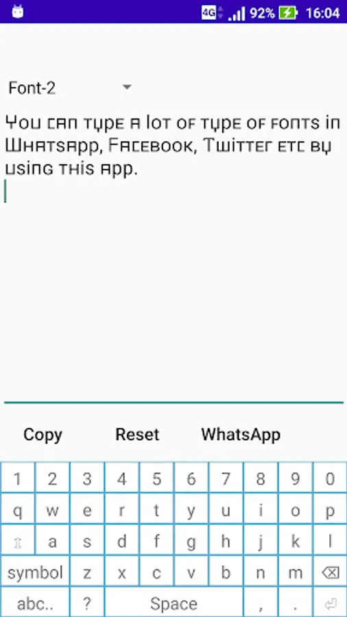 This App provides some alternatives fonts for Social Media Apps like WhatsApp, FaceBook, Twitter, Instagram, Line etc.