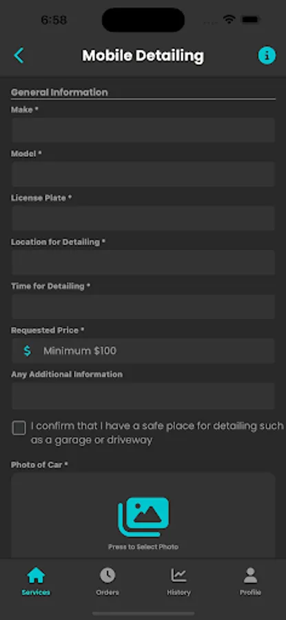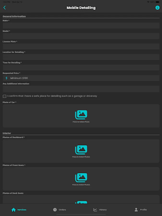 Just take some pictures of your car, upload them to our app, and set your desired price for the service. Choose a convenient date, time, and location for the detailing. Your request then gets posted to our network of skilled detailers.