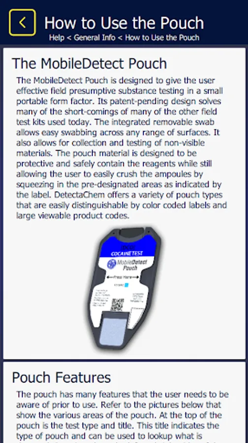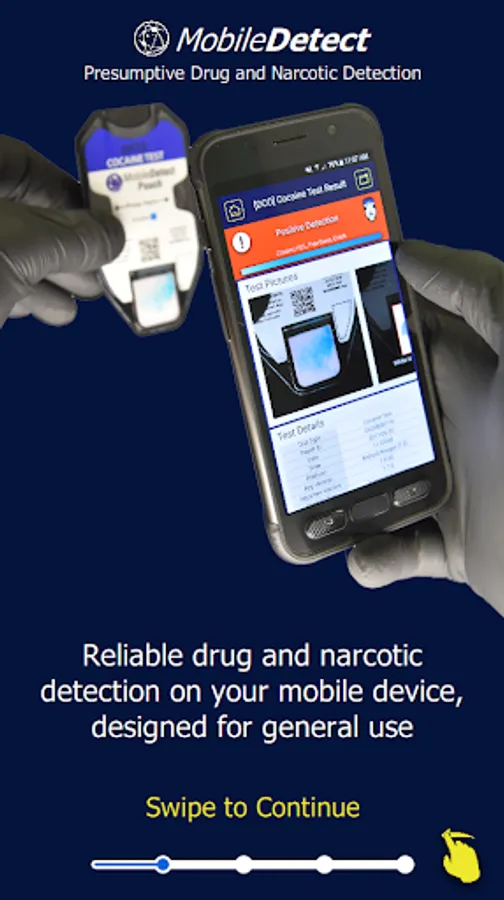 The revolutionary MobileDetect app converts your smartphone or tablet into a portable, presumptive drug detection tool. The app works with MobileDetect drug pouches which are innovative, highly accurate, low-cost test kits that use recognized National Institute of Justice chemical reagents to produce color reactions specific to different drugs.