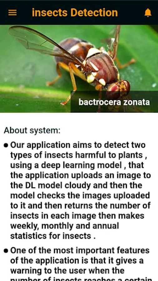 Our application aims to detect two types of insects harmful to plants , using a deep learning model , that the application uploads an image to the DL model cloudy and then the model checks the images uploaded to it and then returns the number of insects in each image then makes weekly, monthly and annual statistics for insects