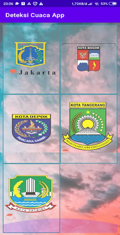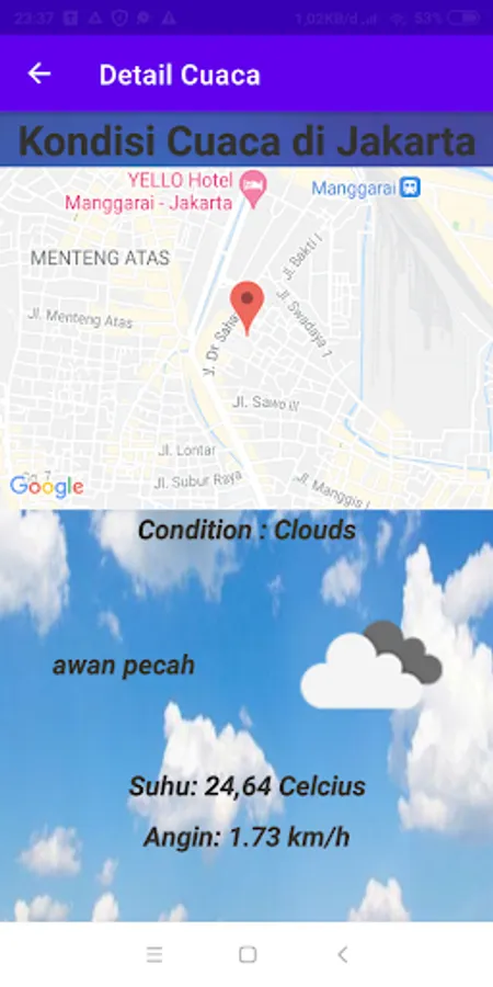 This application contains temperature information, weather predictions, and Google Maps in 5 areas, namely: Jakarta, Bogor, Depok, Tangerang, and Bekasi.