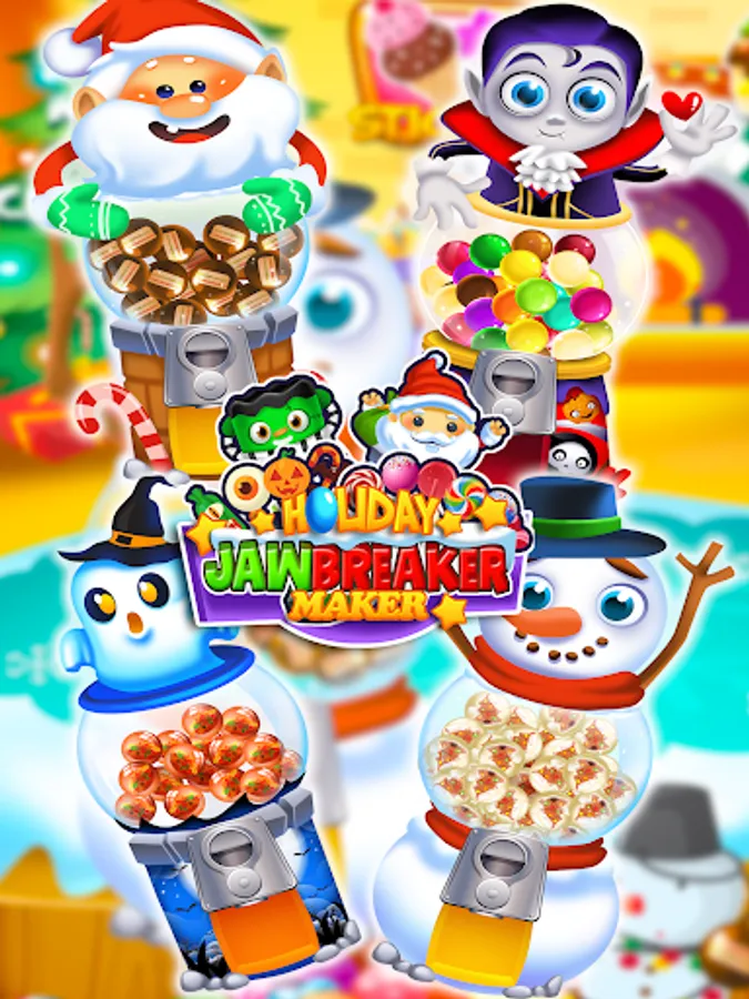 Decorate your Jawbreaker Machine with a variety of Halloween and Christmas Stickers! Endless fun in Holiday Candy Jawbreaker Maker.