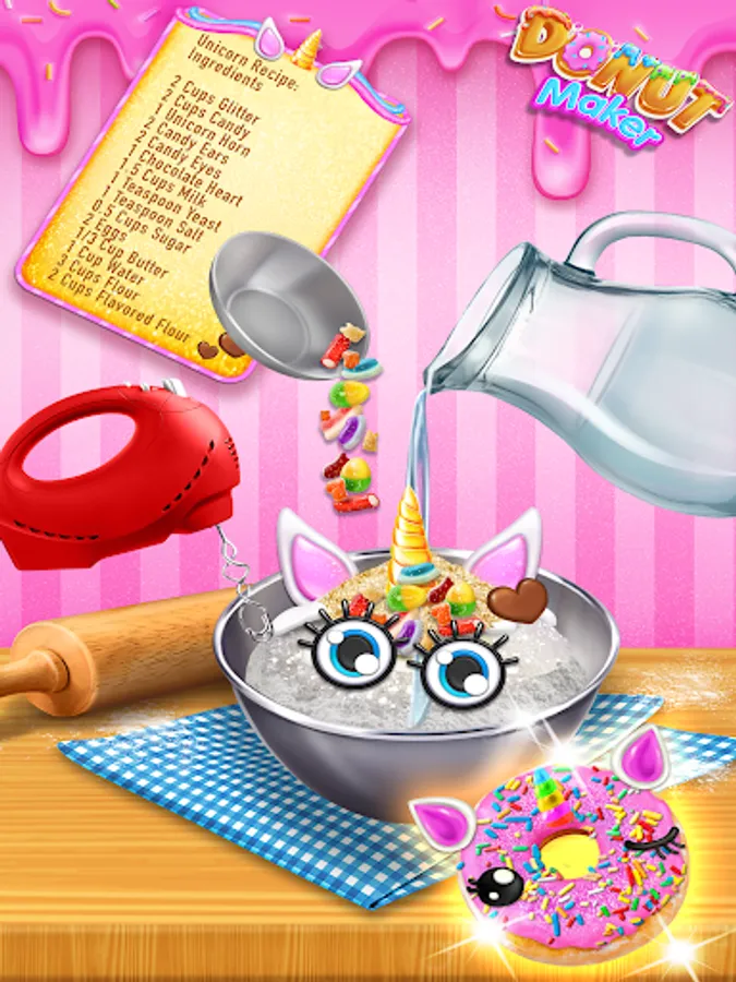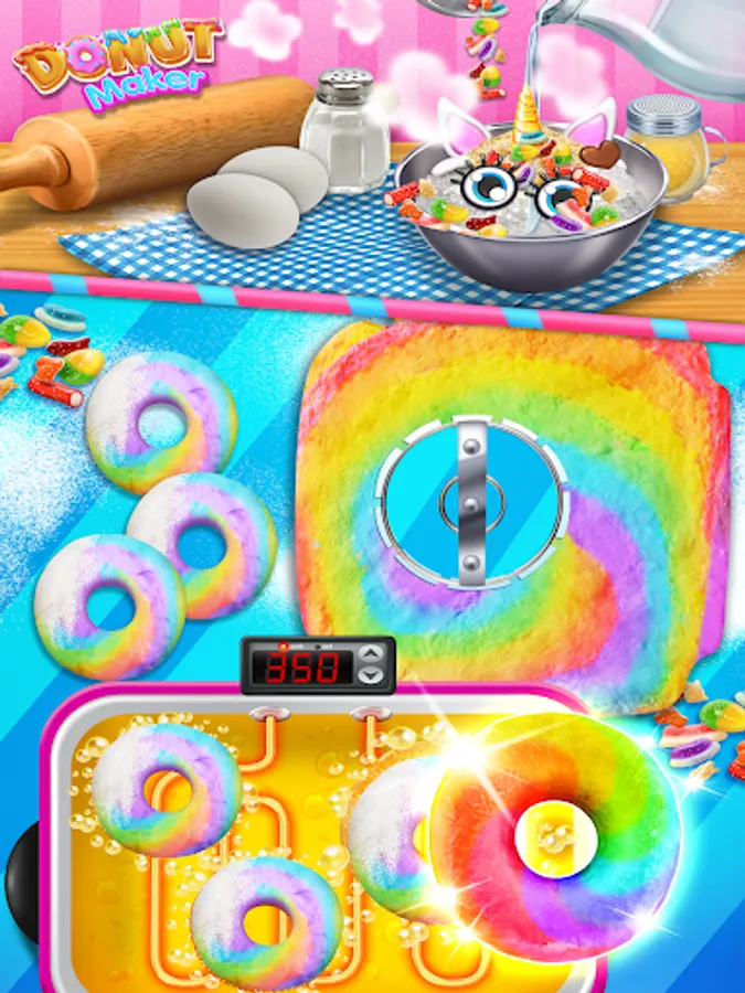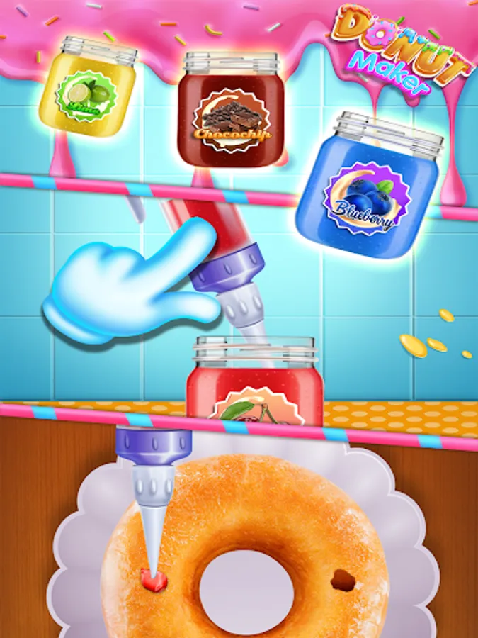 Realistic Cooking Steps! Select Flavor, Mix Ingredients, Refrigerate, Roll Dough, Fry Donuts, Fill with Jelly, Select Glaze and Decorate! Be a Baker Chef!
