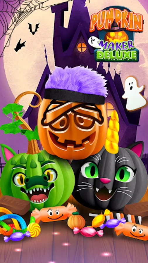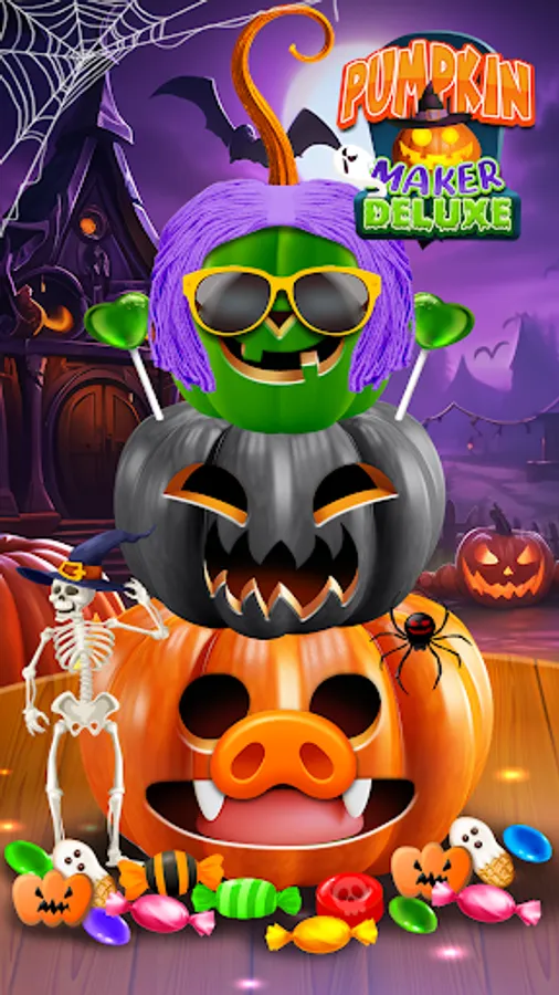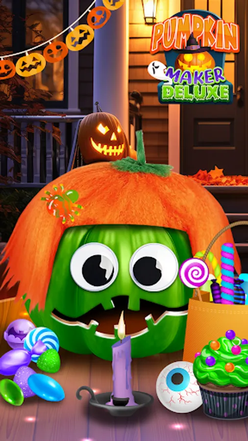 Make Spooky and Fun Pumpkin creations and express your Ghoulish side. 300+ Halloween Themed Items! Create endless Halloween scenes with 20 Backgrounds, 50+ Pumpkin Shapes and Colors, Scary Faces, Glowing Eyes and Mouths, Funny Animal Noses, Glasses, Stems, Wigs, Candy, and Spooky Décor.