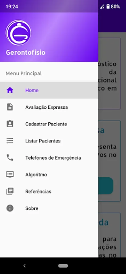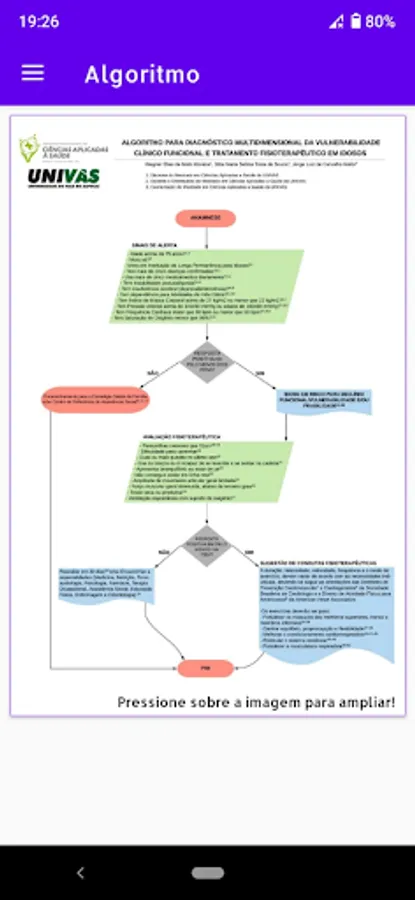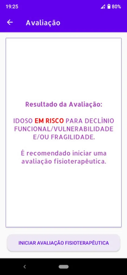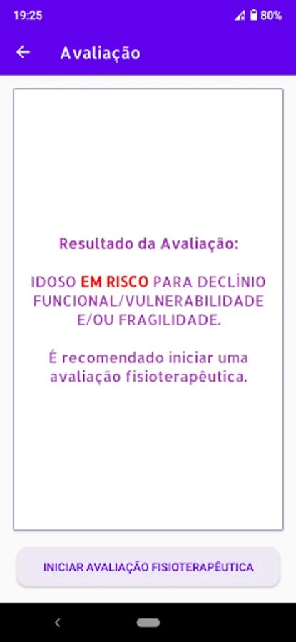 Gerontofisio is an offline application that does not need to create profiles or accounts for specific access. The application was built from the validation of the algorithm for the multidimensional diagnosis of clinical functional vulnerability and physical therapy treatment in the elderly.