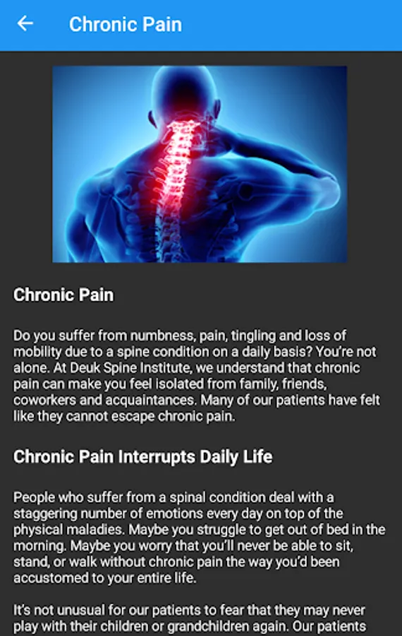 The Deuk Spine Institute app is your one-stop-shop for all things spine! Here are just a few of the features we currently offer.