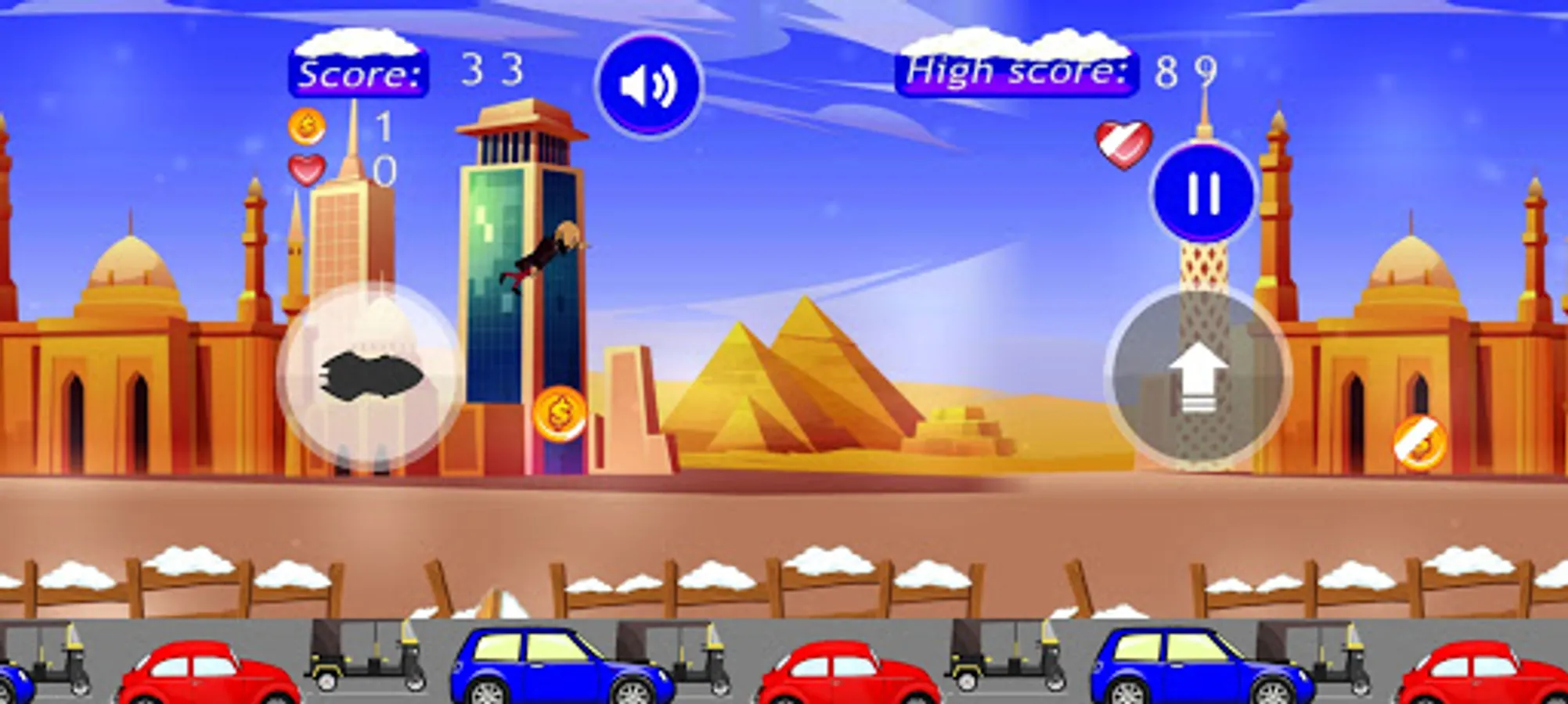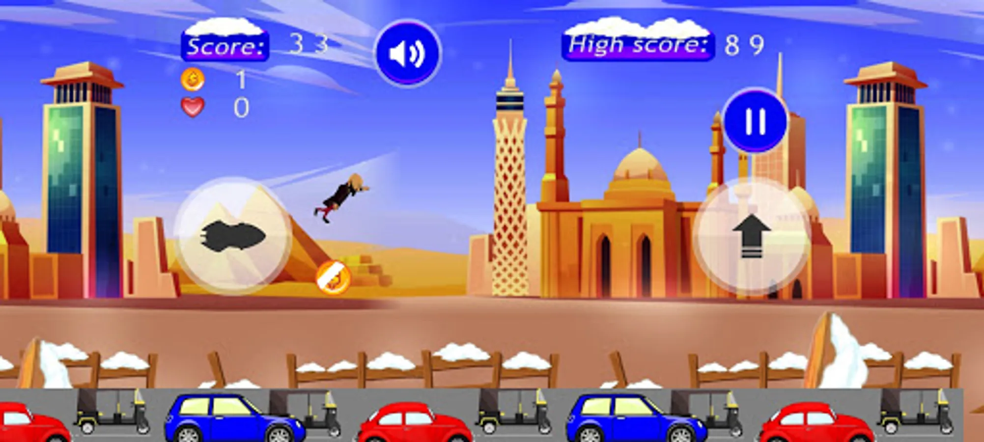 Move the character of Muhammad Ramadan by pressing the right arrow and escape from insects, hit the missiles and collect the gold